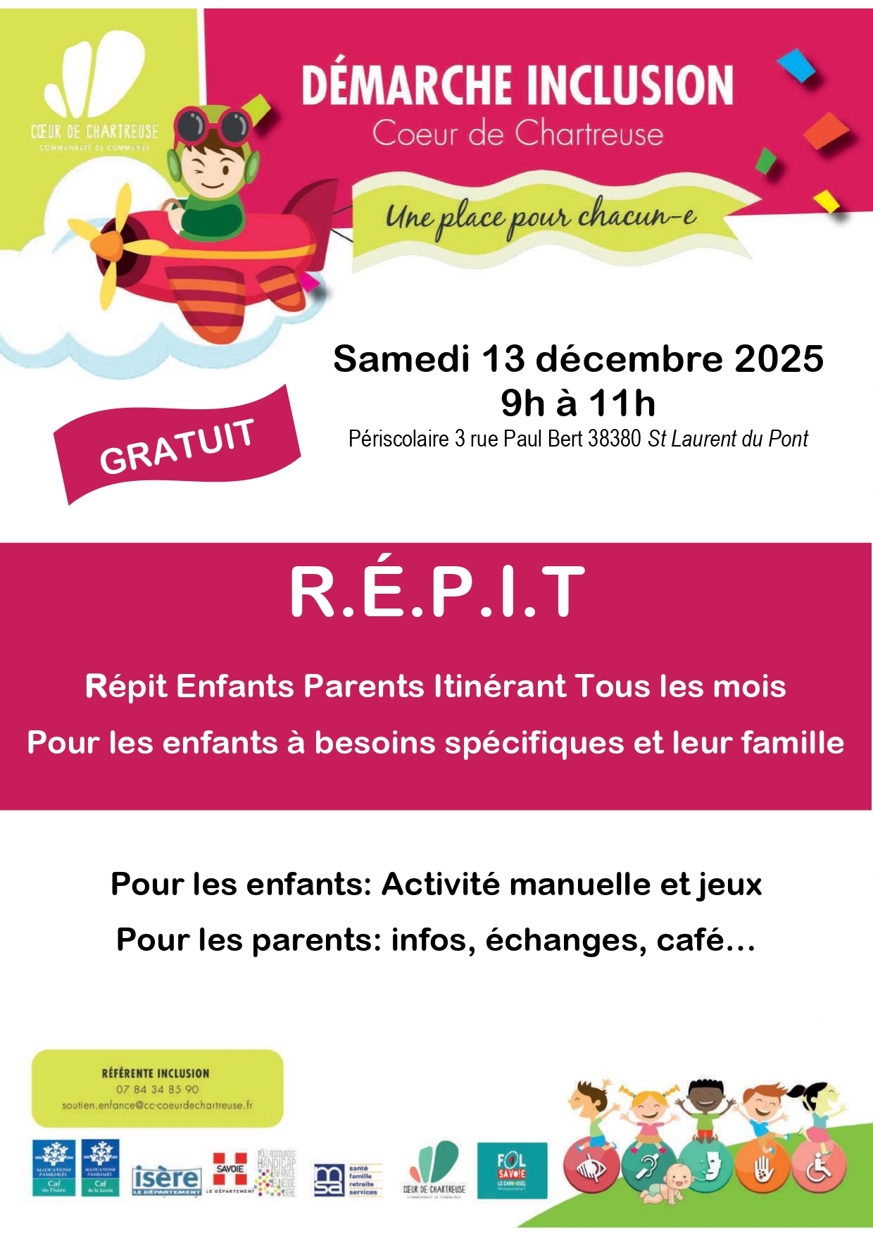 Le Samedi 13 décembre de 9h à 11h, à l’école du Bourg, à St-Laurent-du-Pont, le Groupe Réseau propose son dernier temps de répit familles de 2025 !