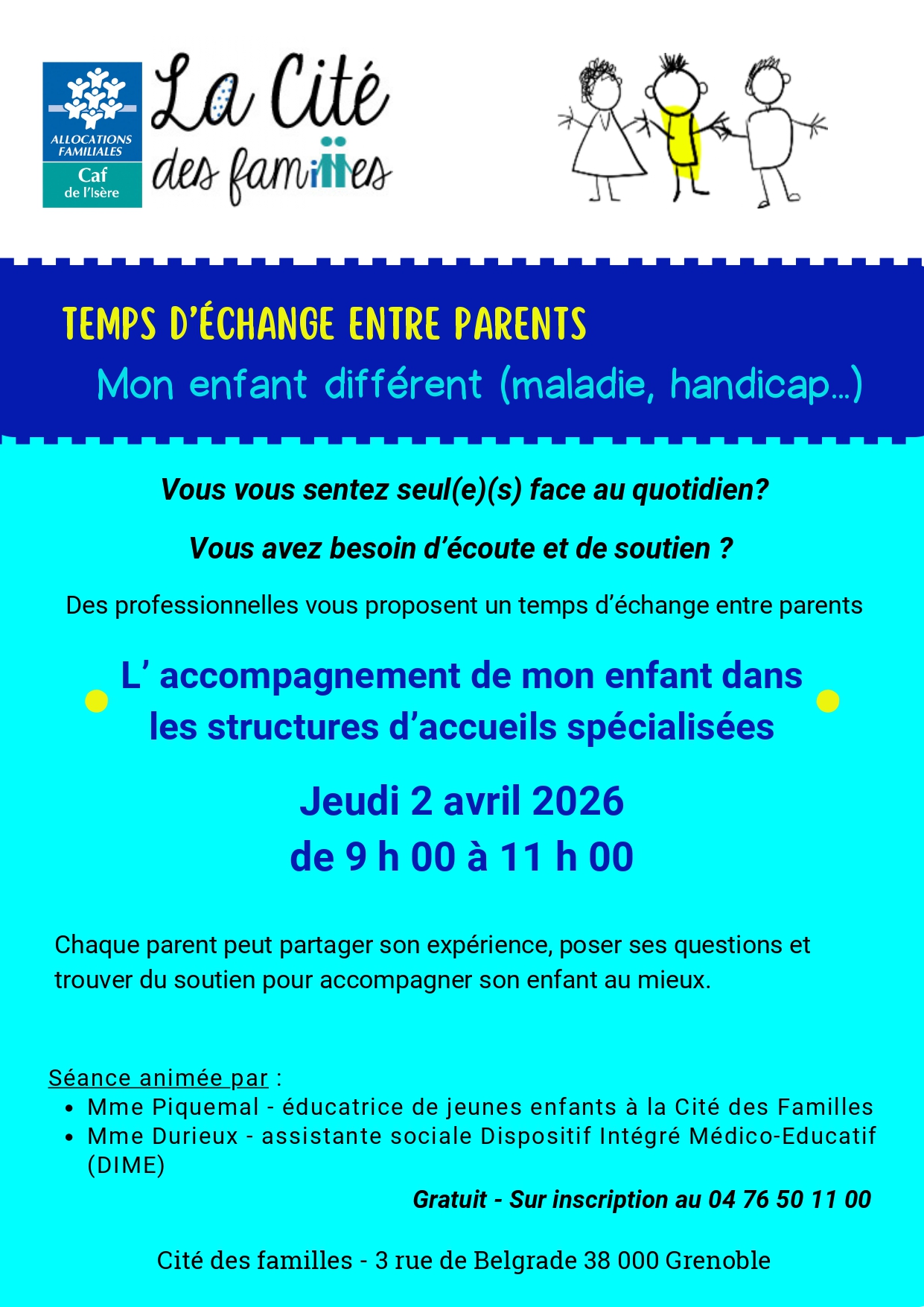 Ce temps d’échange est ouvert à tous les parents et proches d’enfants en situation de handicap, avec des besoins spécifiques ou des troubles des apprentissages.